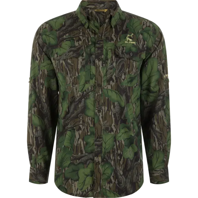 We took our heritage Wingshooter and gave it a complete overhaul.  We constructed the Trey out of a silky 95% Polyester and 5% Spandex fabric.  The performance fabric is lightweight at 95 GSM which allows moisture to wick quickly from the body.  It also has a UPF30 rating for sun protection and has a natural stretch for ease of movement.  The Ol' Tom Camo Wingshooter Trey has a classic fit, a hidden button-down collar, two button-through flap chest pockets, and a vented cape back along with a laser-punched vented back.  The pocket system includes a hidden zippered pocket on the right and a Magnattach™ closure behind the left pocket. It has a sculpted hem which allows you to wear tucked or untucked and has an adjustable tab if you want to roll up your sleeves.  Inside the hem is a built-in sunglass wipe. We took a classic and added a ton of technical features, creating a new Ol' Tom standard in performance shirts. Â
