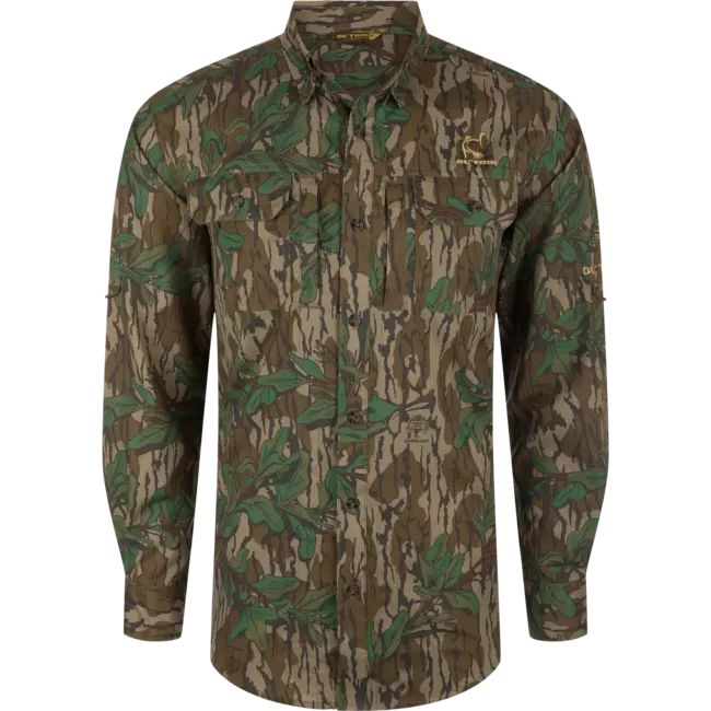 We took our heritage Wingshooter and gave it a complete overhaul. We constructed the Trey out of a silky 93% Polyester and 7% Spandex fabric. The performance fabric is lightweight at 102 GSM which allows moisture to wick quickly from the body. It also has a UPF30 rating for sun protection and has a natural stretch for ease of movement. The Youth Ol' Tom Camo Wingshooter Trey has a classic fit, a hidden button-down collar, two button-through flap chest pockets, and a vented cape back along with a laser-punched vented back. The pocket system includes a hidden zippered pocket on the right and a Magnattach™ closure behind the left pocket. It has a sculpted hem which allows you to wear tucked or untucked. Inside the hem is a built-in sunglass wipe. We took a classic and added a ton of technical features, creating a new Ol' Tom standard in youth performance shirts.